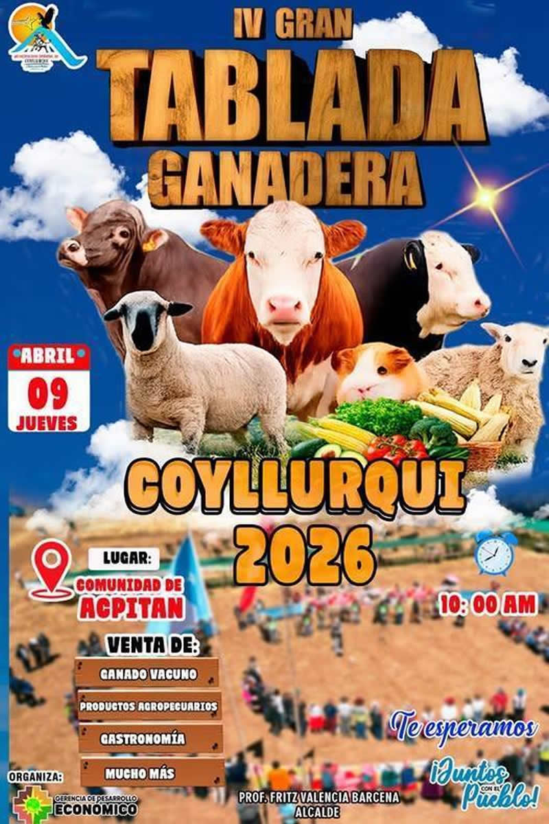 La Municipalidad Distrital de Coyllurqui, a travรฉs de la Gerencia de Desarrollo Econรณmico, en coordinaciรณn con la comunidad de Acpitรกn te invita a participar de la IV Gran Tablada Ganadera Coyllurqui 2026, un importante evento que promueve el desarrollo agropecuario de nuestro distrito.